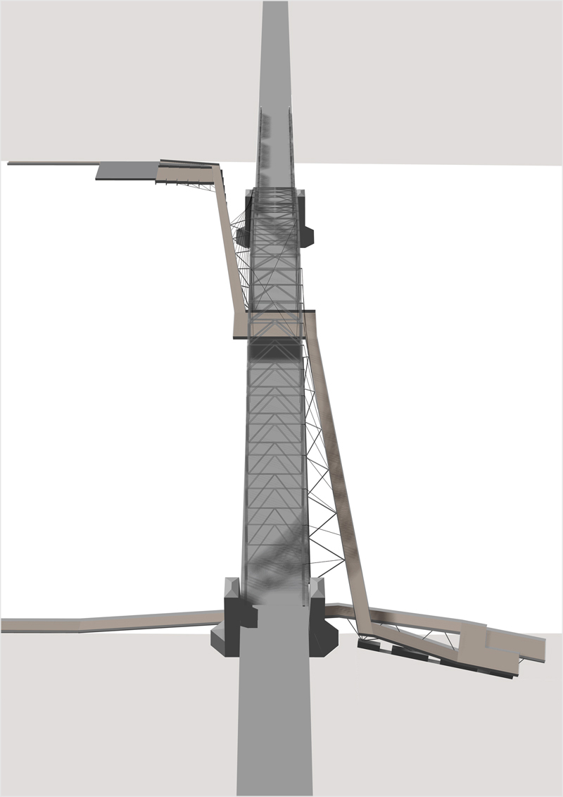 The new pathway merges with the geometry of the existing structure while establishing a new public space, a platform suspended within the steel arch.
