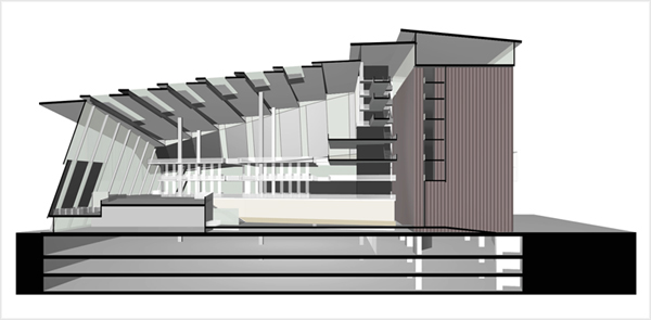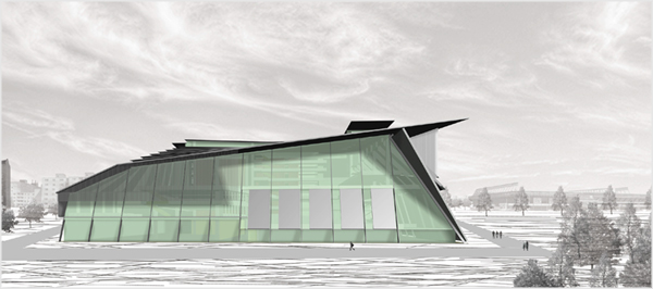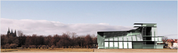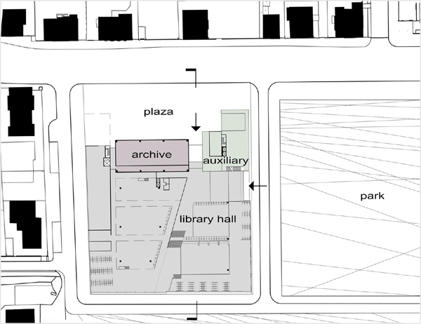 The proposed library is an allegorical treatment of a historical event. At the unveiling of the Jan Hus monument in Prague’s Old Town Square in 1915, no speech or ceremony was permitted given the political climate of the time. Hus, a religious reformer, had become a symbol of resistance to outside powers. Citizens responded by enveloping the statue in carpet of flowers. Covering the monument was a quiet acknowledgement of its significance, simultaneously concealing the artwork while conveying a shared understanding of the value of what is hidden. In the proposed library, an ephemeral cover of metal plates, mesh, and glass conspire to envelop the striated stone clad volume of the Czech National Archive. Responding to the varied nature of activities within the library, the malleable system of enclosure regulates the entry of light into the main hall while conveying the character of the multi-faceted activity within.