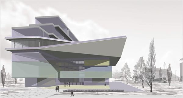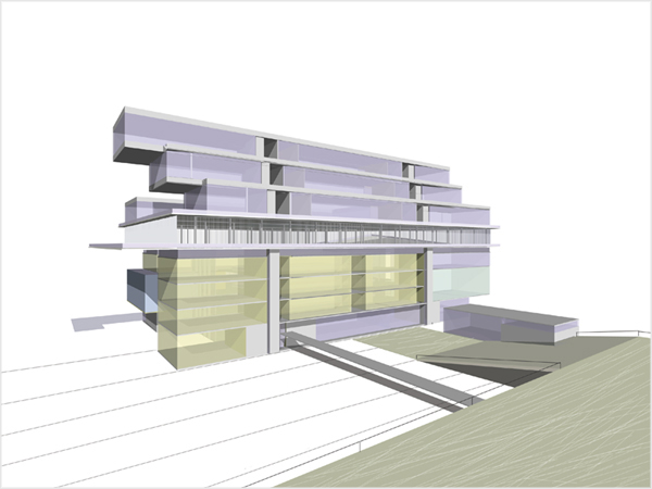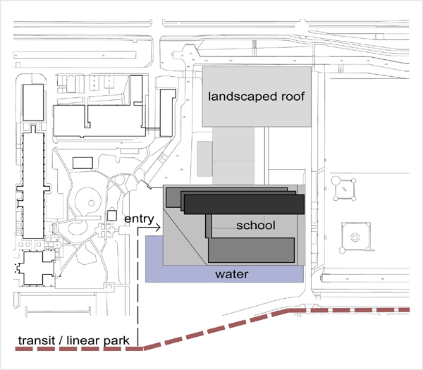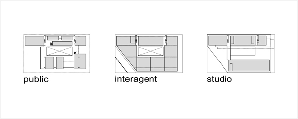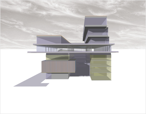 Public uses are organized around a common entry hall at the lower levels. Pockets of casual meeting space are interspersed with programmed spaces around the hall. These voids between programmed spaces also serve as openings for natural lighting and ventilation of the hall. Composed of a series of linear volumes framing landscaped outdoor spaces, the studios at the top of the structure provide workspace with balanced natural lighting and good visibility of and access to the shared outdoor spaces. Between the public and studio realms is the interagent, containing the labs for material research, model shop, computer lab, and sketching/drawing studio, as well as a gym and the building mechanical systems on one large single floor plate.