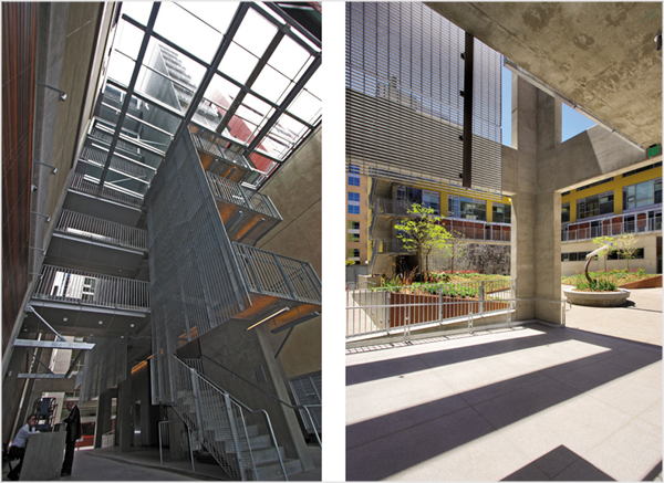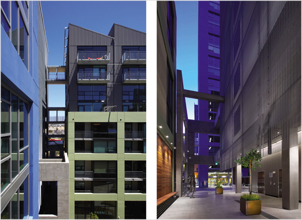 The project takes advantage of the temperate climate with landscaped courtyards giving access to commercial, retail, and live/work spaces at ground level.