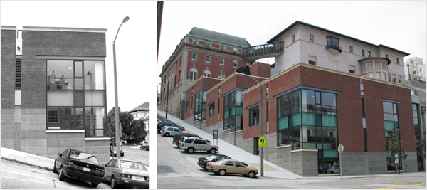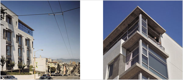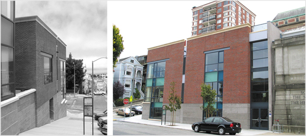 Located in San Francisco, California this addition to an existing school campus takes the form of three discrete volumes stepping down the steeply sloping site housing science labs and art classrooms above grade while a theater is below grade.