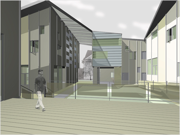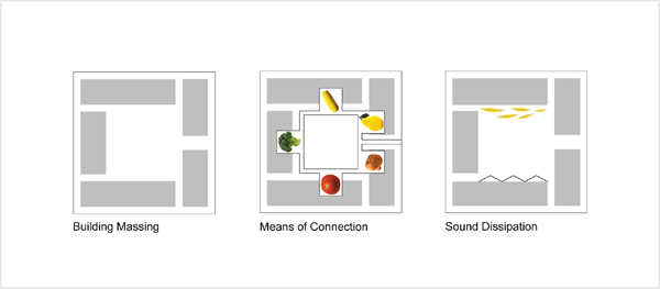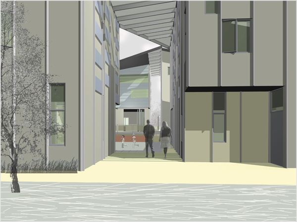 The project is broken into distinct units similar in scale to the surrounding single family homes. Space for gardening is provided in the courtyard and along the south edge of the site, acting as both a social activity and endorsement of healthy eating habits. Surface treatment and planting serve to dissipate noise in the courtyard.