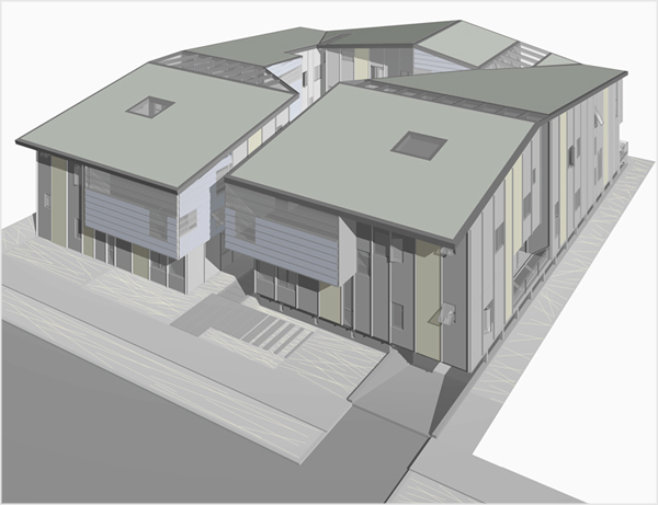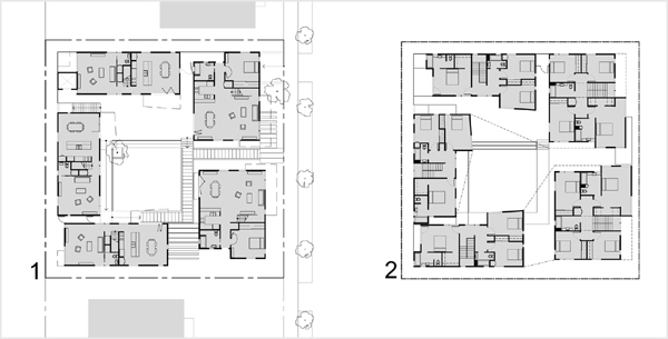 This five unit residential project designed around a courtyard utilizes the existing soil on site as a building material and means of social connection. The three and four bedroom units are intended for moderate income families with children.